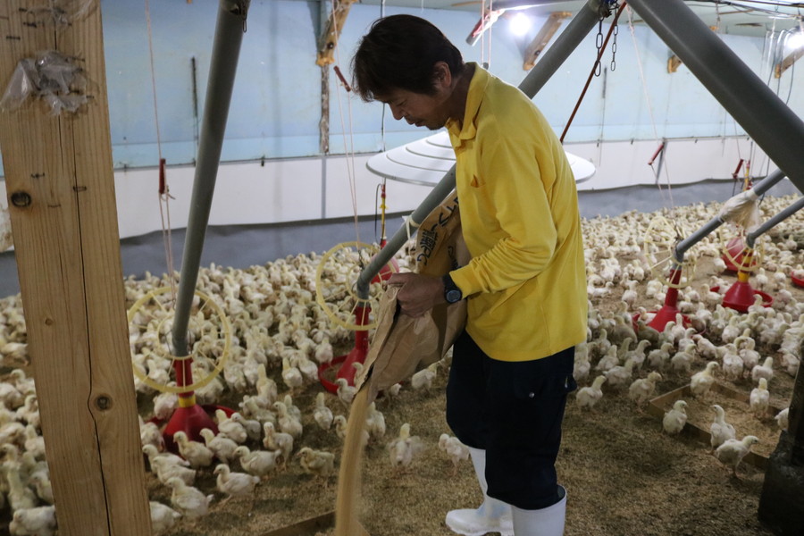 一口に養鶏場と言っても様々。北条養鶏場では生後0日、生まれたばかりの雛の状態から飼育をスタートします。役50日前後期間飼育し、米久おいしいとり株式会社出荷します。